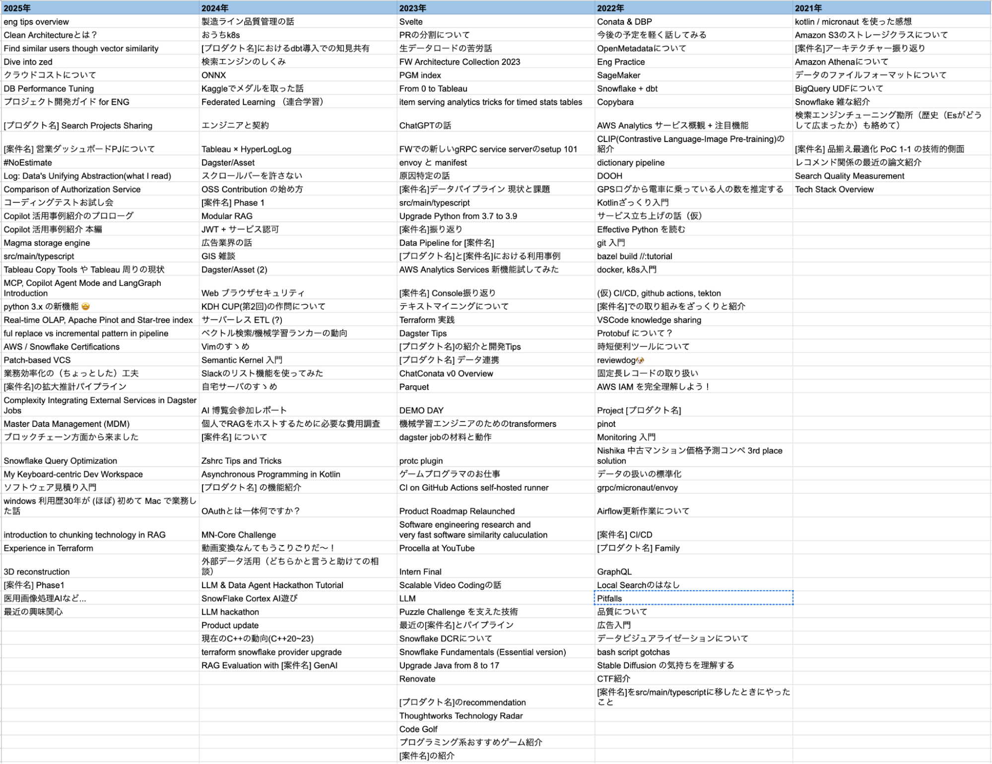 Lunch Talk の最大の特徴は、そのテーマの多様性です。業務で使われている技術の深い話から、社内プロダクトや新しいツールの紹介まで、発表者の「話したい!」という気持ちを尊重しながら、本当に多彩なトークが繰り広げられてきました。