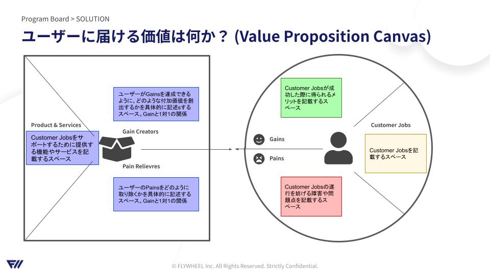 バリュープロポジションキャンバスは、Customer Jobs*1 を遂行する上での Pains*2、ジョブが成功した際の Gains*3 を整理し、それに対して Products & Services*4 が提供する具体的な解決策(Pain Relievers*5)と生み出す価値(Gain Creators*6) が適合しているかを確認するためのフレームワークです 。