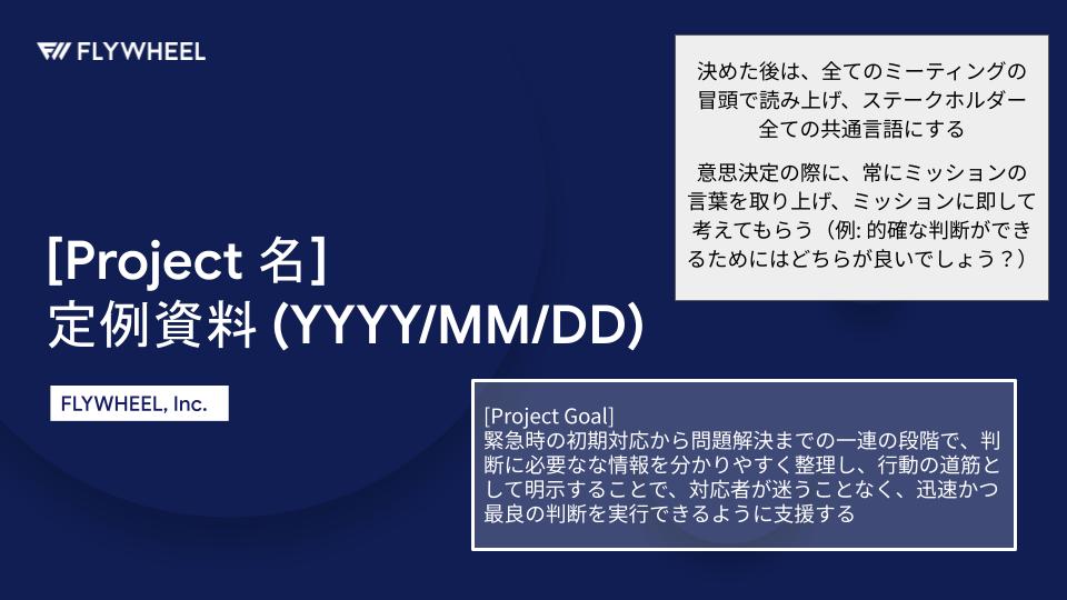 プロダクトミッションは策定して終わりではなく、その後の運用が重要です。 策定したミッションは毎回のミーティング冒頭で読み上げ、関係者全員の共通言語化を図ります。
