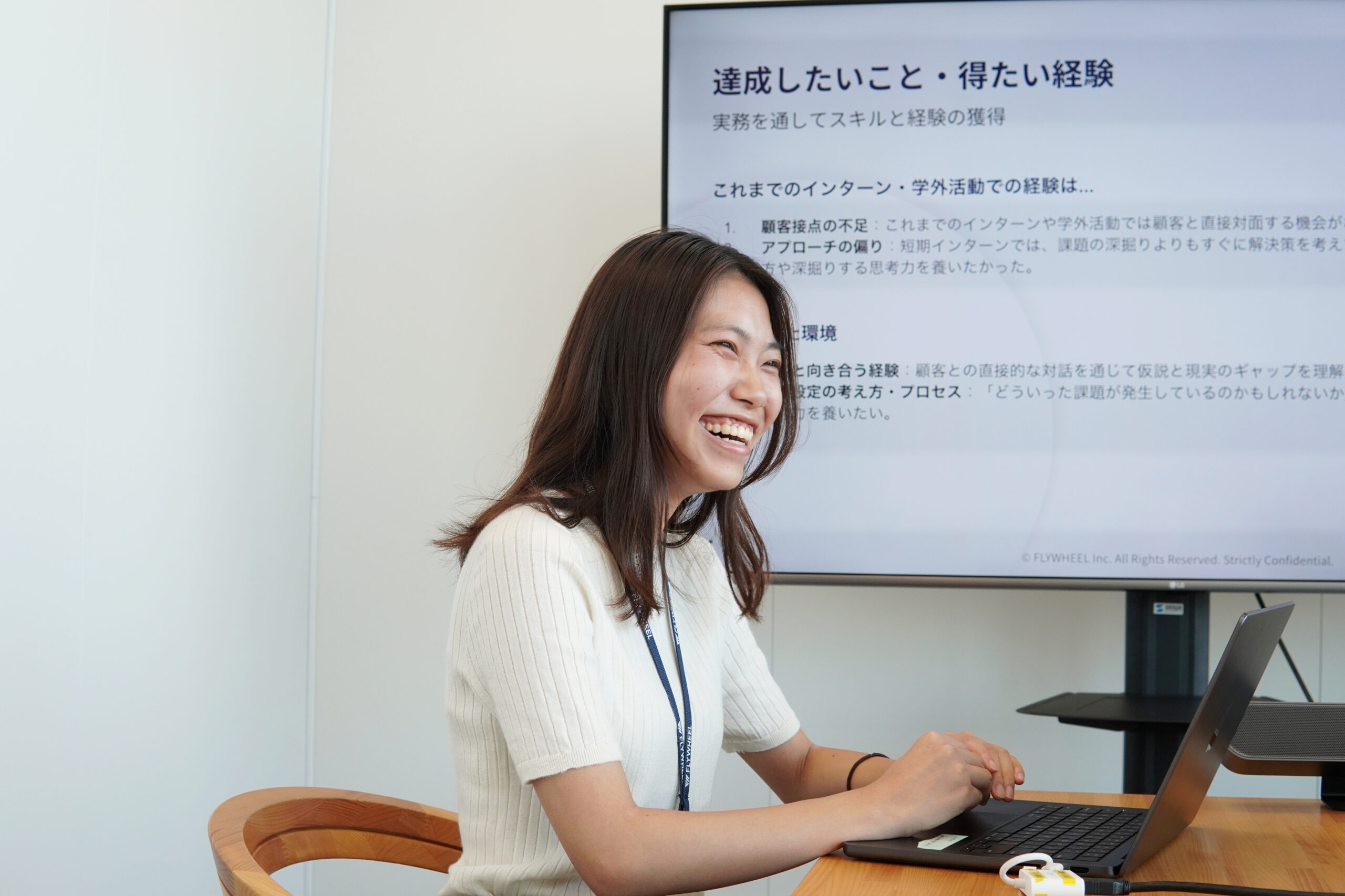 また、これまでの短期インターンでは、課題を深く掘り下げる時間がなく、解決策を先に考え、後から課題を後付けするような提案が多くなっていました。そのため、長期で課題設定から解決までの思考力を養いたいと考えていました。これまでのインターンでは顧客と直接対話する機会も少なかったため、フライウィールで実務を通してその経験を積みたいと思い、参加を決めました。