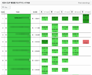 KDH競技開始後、わずか 5 分の間に 15 名がこの問題を正答する白熱した幕開けとなりました。上位の参加者が順調に正答を積み上げていましたが、終了 15 分前の時点で最終問題の正答者が現れないまま、結果発表を待つ形となりました。