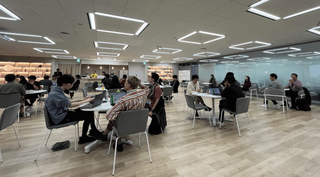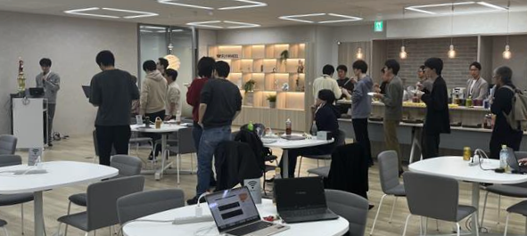 イベントはオンライン・オフラインのハイブリッドで開催しました。フライウィールを含めて 7 社から 35 名のエントリーがあり、過去最大規模の大会となりました。オフライン会場となったフライウィール新オフィスのカフェテリアにはエンジニア以外の観戦メンバーも集まり、熱気に包まれました。