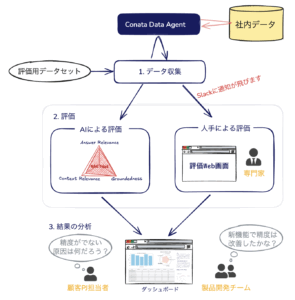 - 評価:収集したデータを対象に「ゴールドスタンダードである人手評価」と「高速で網羅的な AI による評価」を行います。