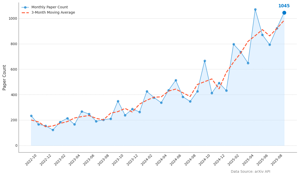 以下のグラフをご覧ください。これは、世界中の研究者が論文を共有するサイト「arXiv」に投稿された、「AI エージェントの評価」に関する論文数の推移を示したものです。