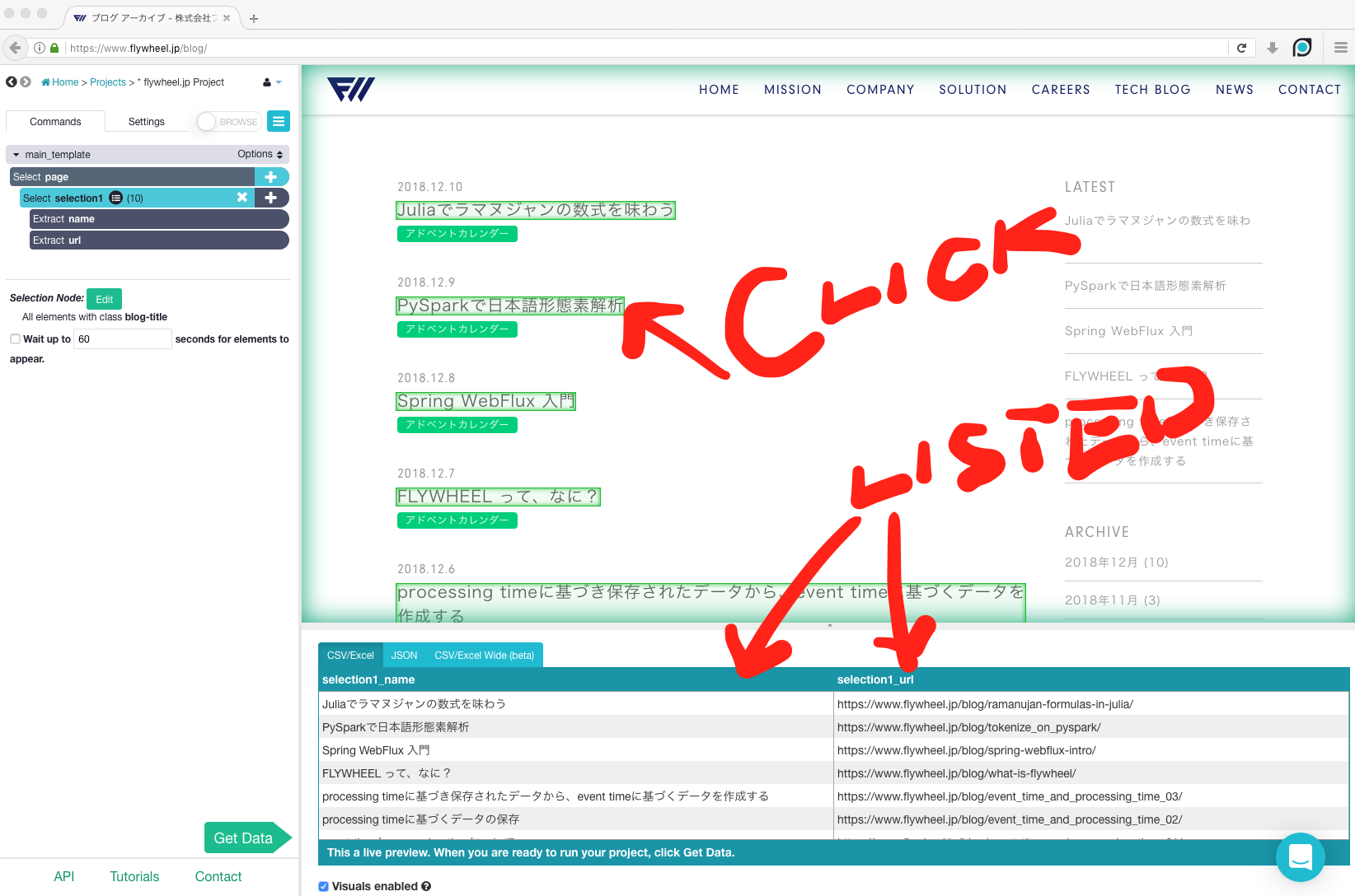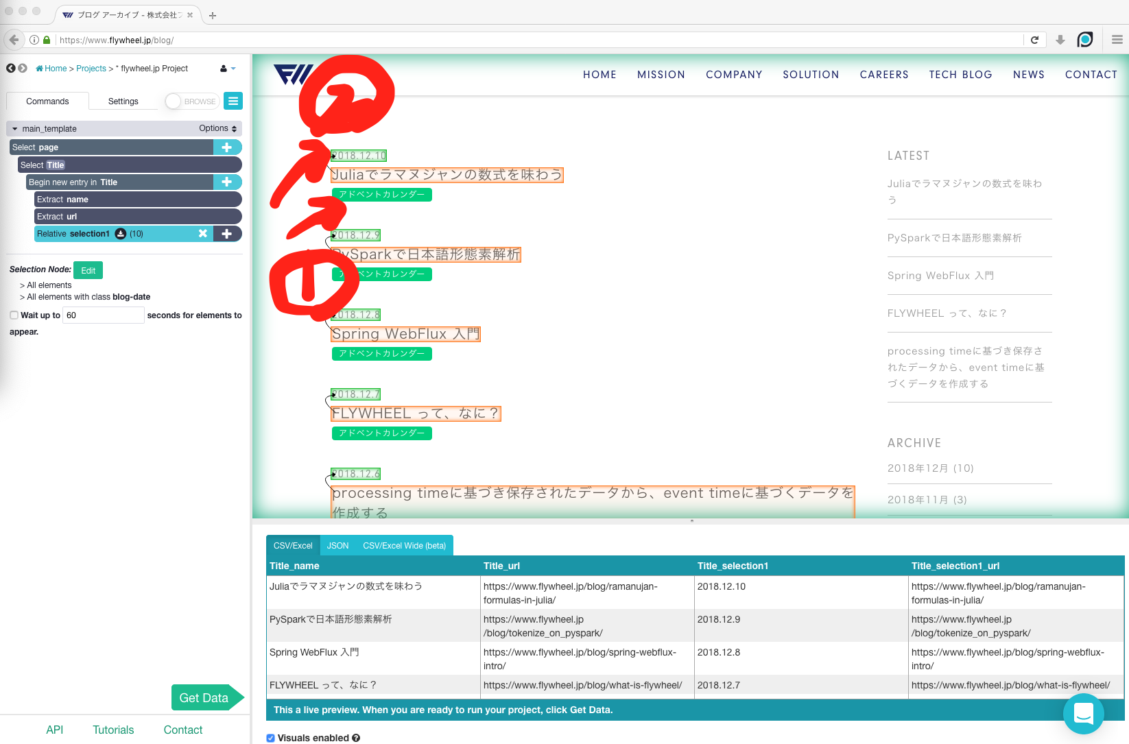 - フライウィールのTECH BLOGは2ページに渡っているが、2回にわけてスクレイピングをすることは禁止。一回の操作でページネーションのリンクを見て何ページでも取得できるようにする。