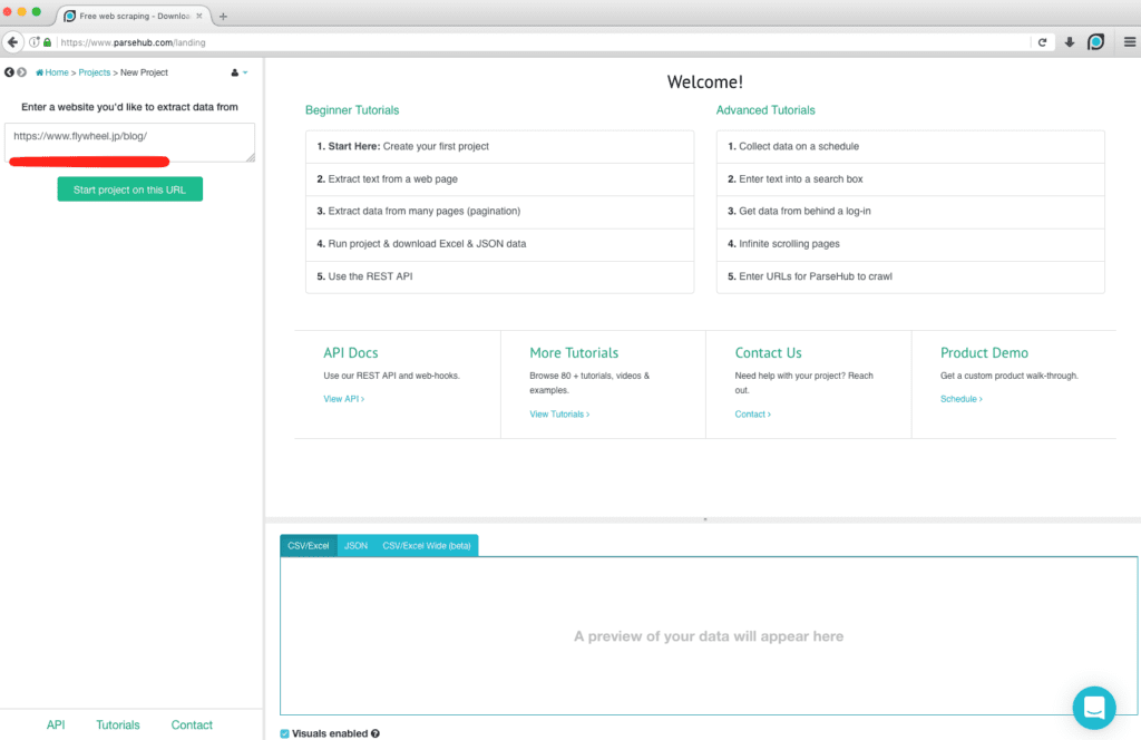 - New Project をクリックし、スクレイピングしたいページのURLをコピー&ペーストします(「次へ」などを読み込ませる場合は、その大元のページのURLを貼ります)。今回はTECH BLOGのトップページである https://www.flywheel.jp/blog/ としています。